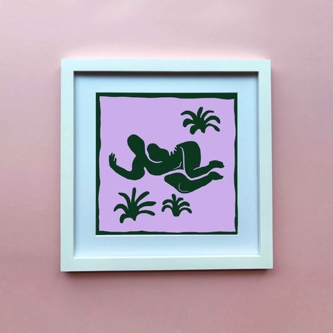 Limited edition prints. Only 25 will be printed.Image description: a deep green abstract silhouette of a reclining nude disabled figure, surrounded by squiggly plant shapes, on a lilac background.